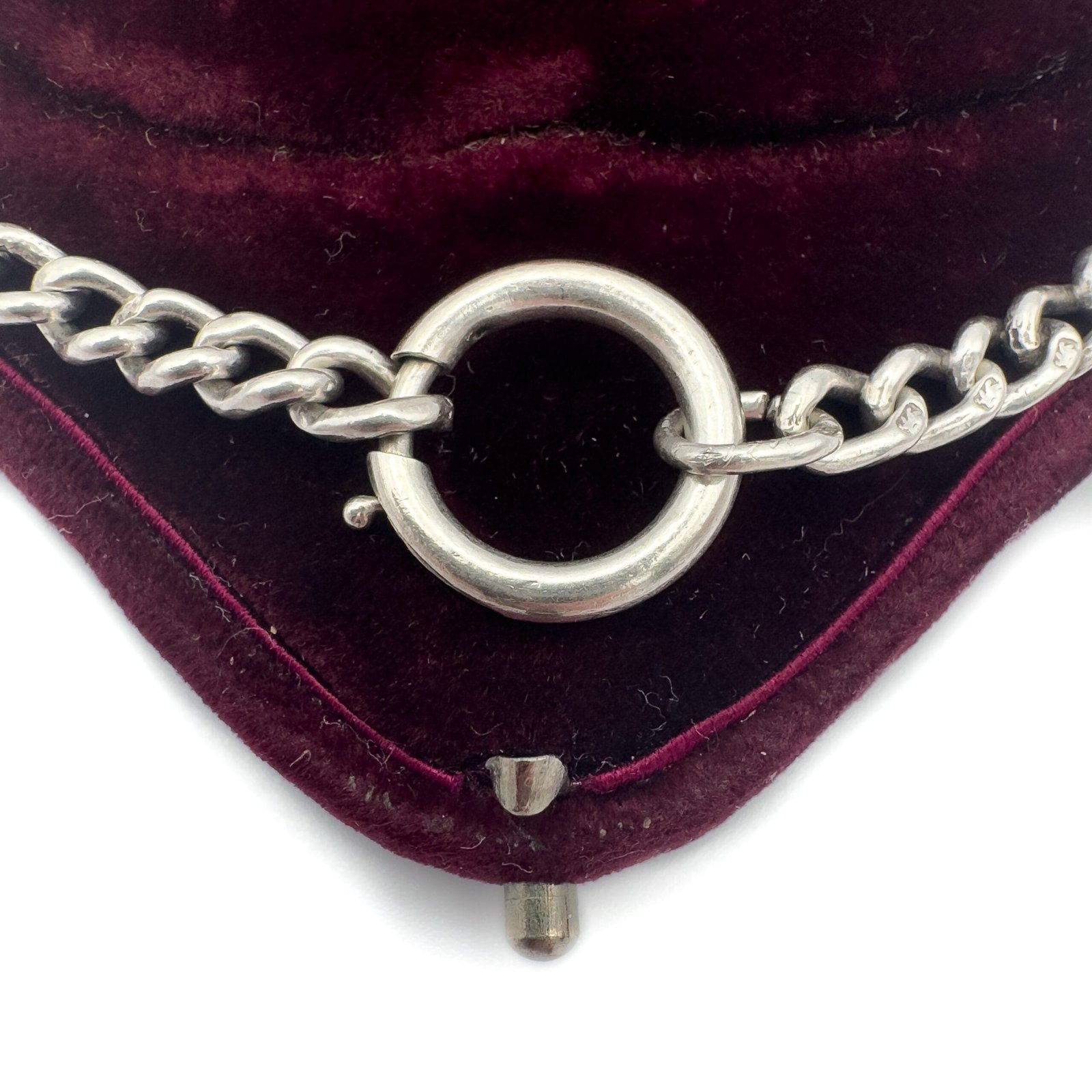 The chain itself was most probably part of an Albert watch chain and the bolt ring which is similar in date has been added recently to make the chain useful again!