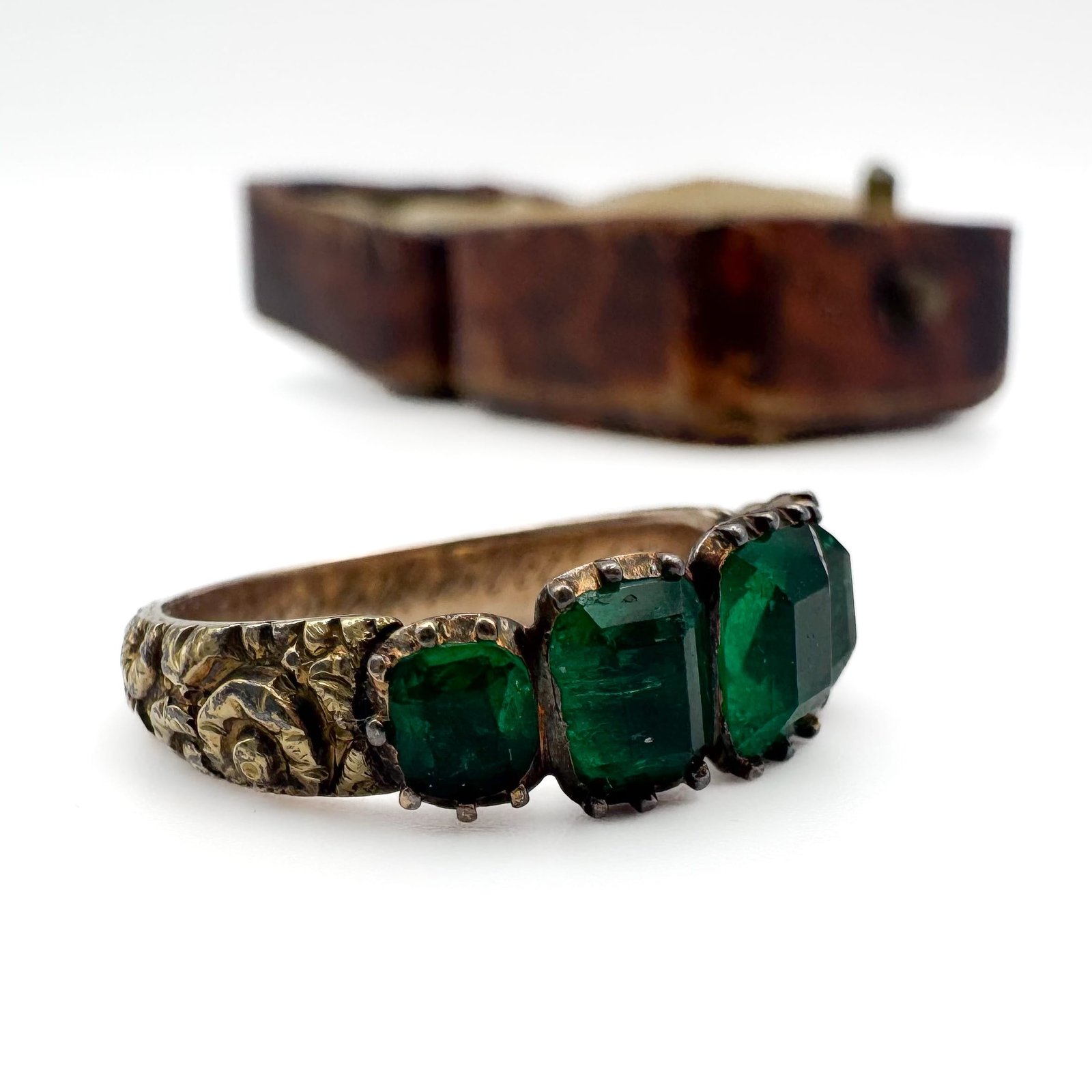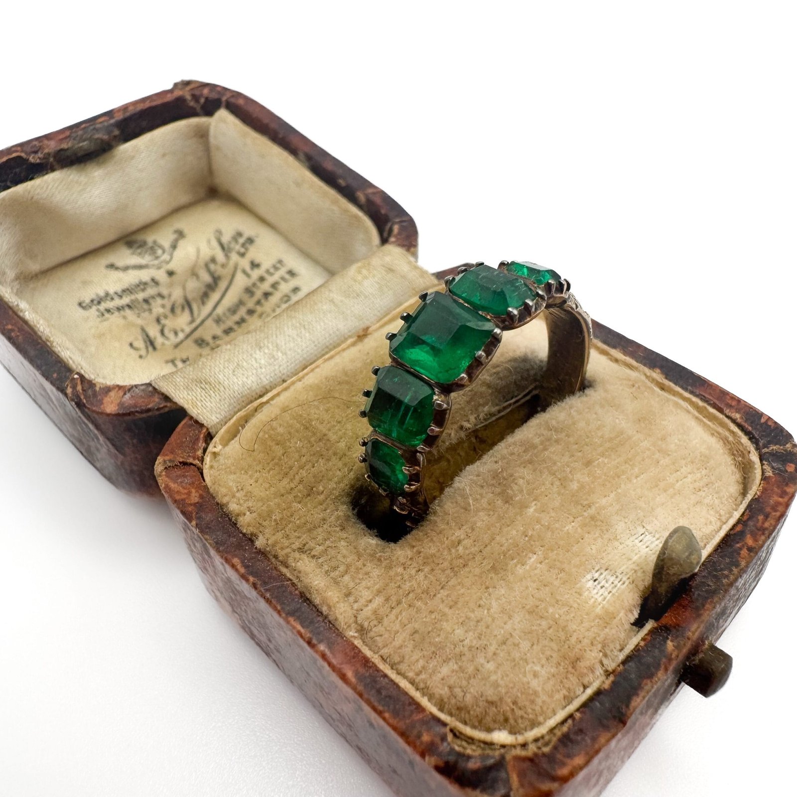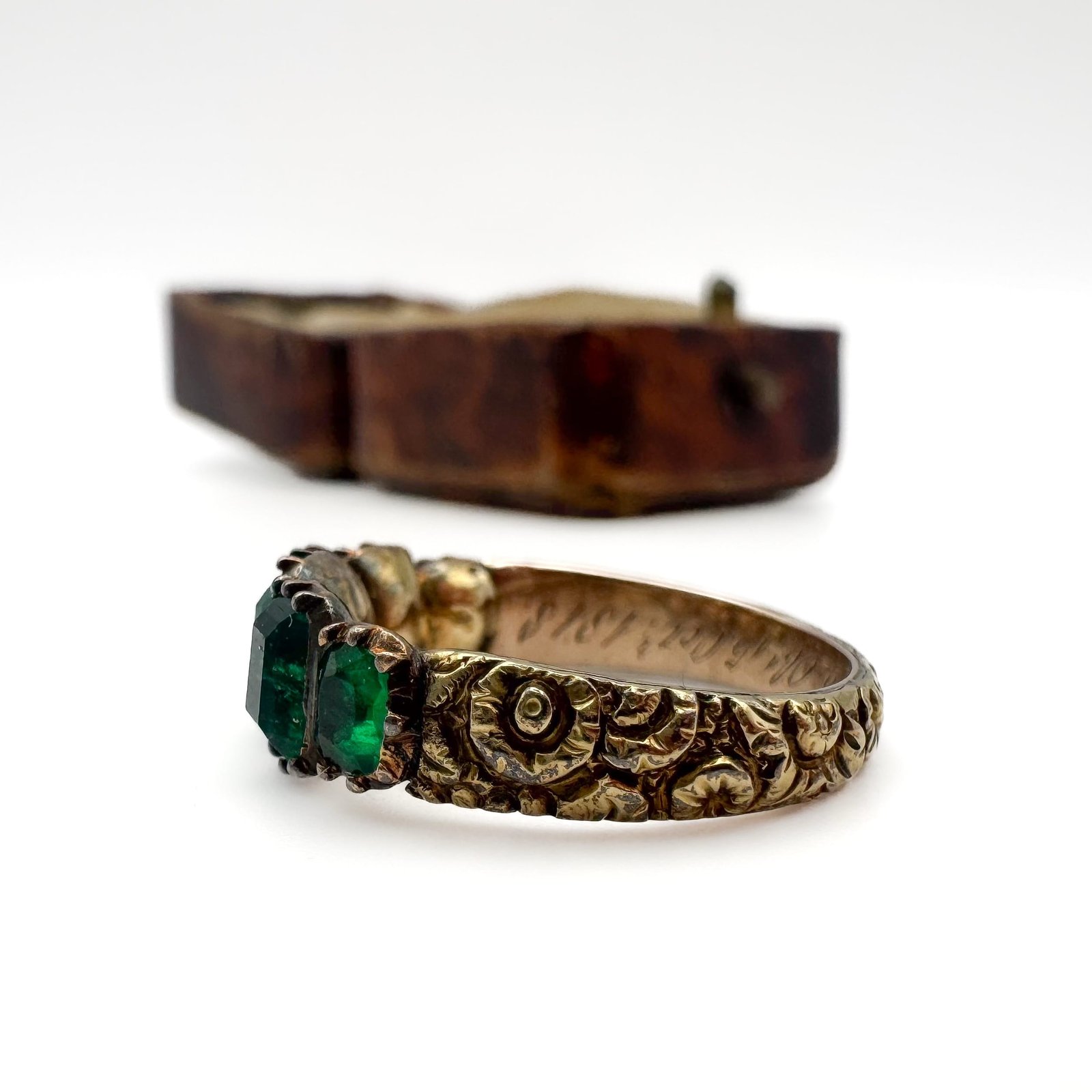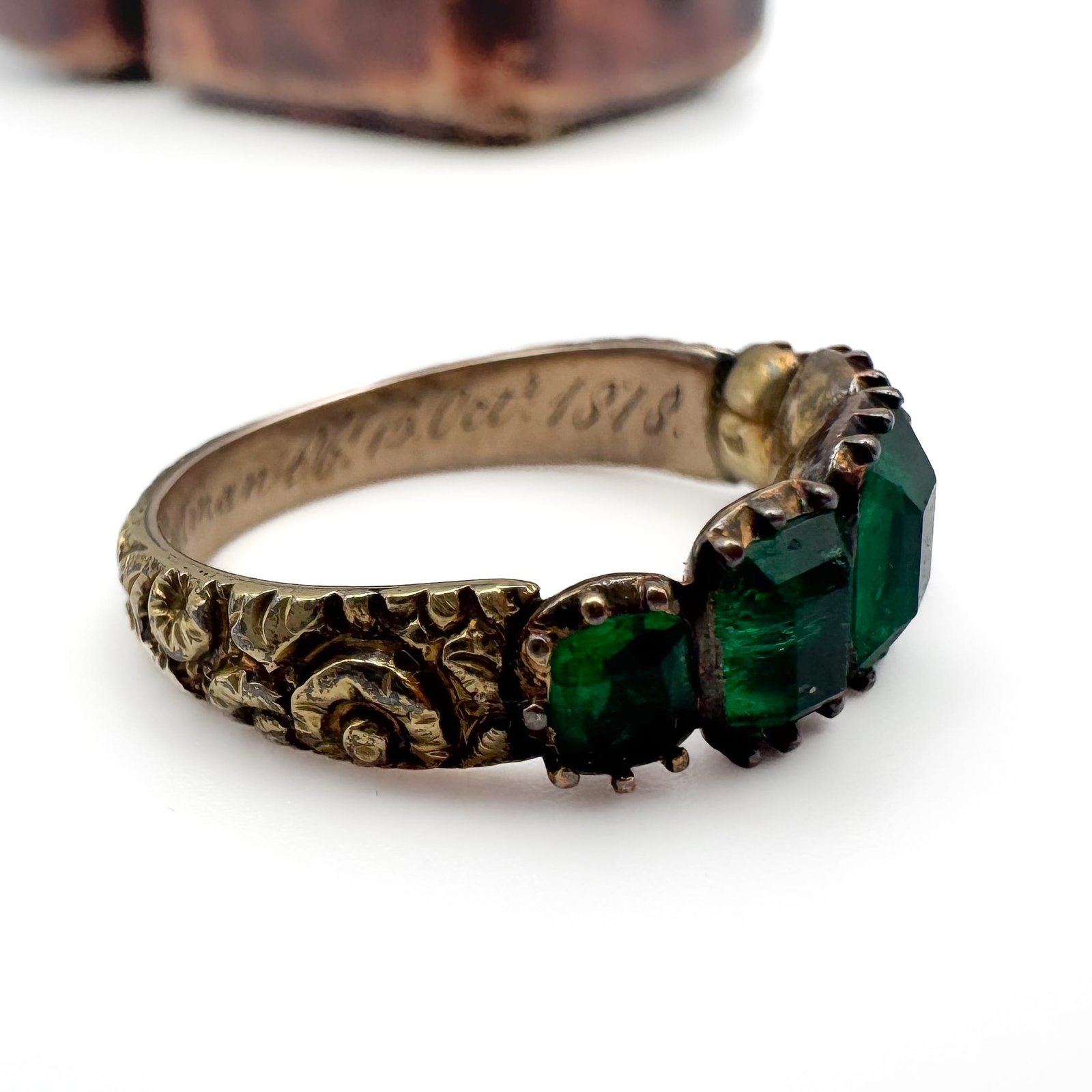 A Georgian gold and emerald five stone ring, having a florally chased shank and the emeralds in closed back settings, engraved inside band ‘Eliz. Mary Priestman, Obt 15 Oct 1818’, the largest emerald measuring 6x5mm, size L 1/2, 3g
