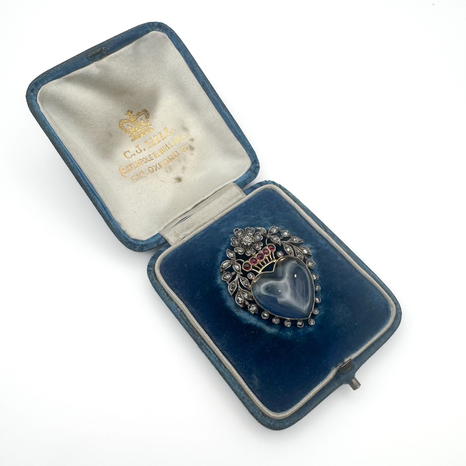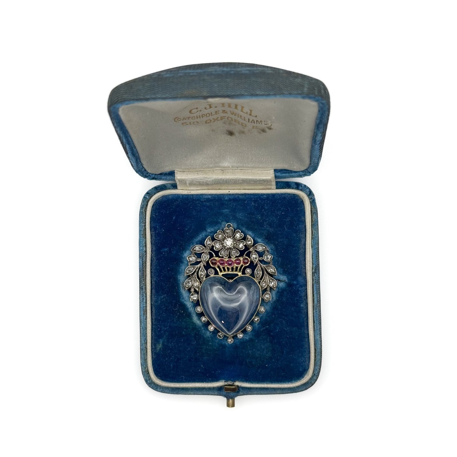 Here we have a truly special Antique in its original fitted box, comprising of a domed heart shaped Rock Crystal set in Gold and Silver, with Ruby cabouchons and Diamonds! 🤤