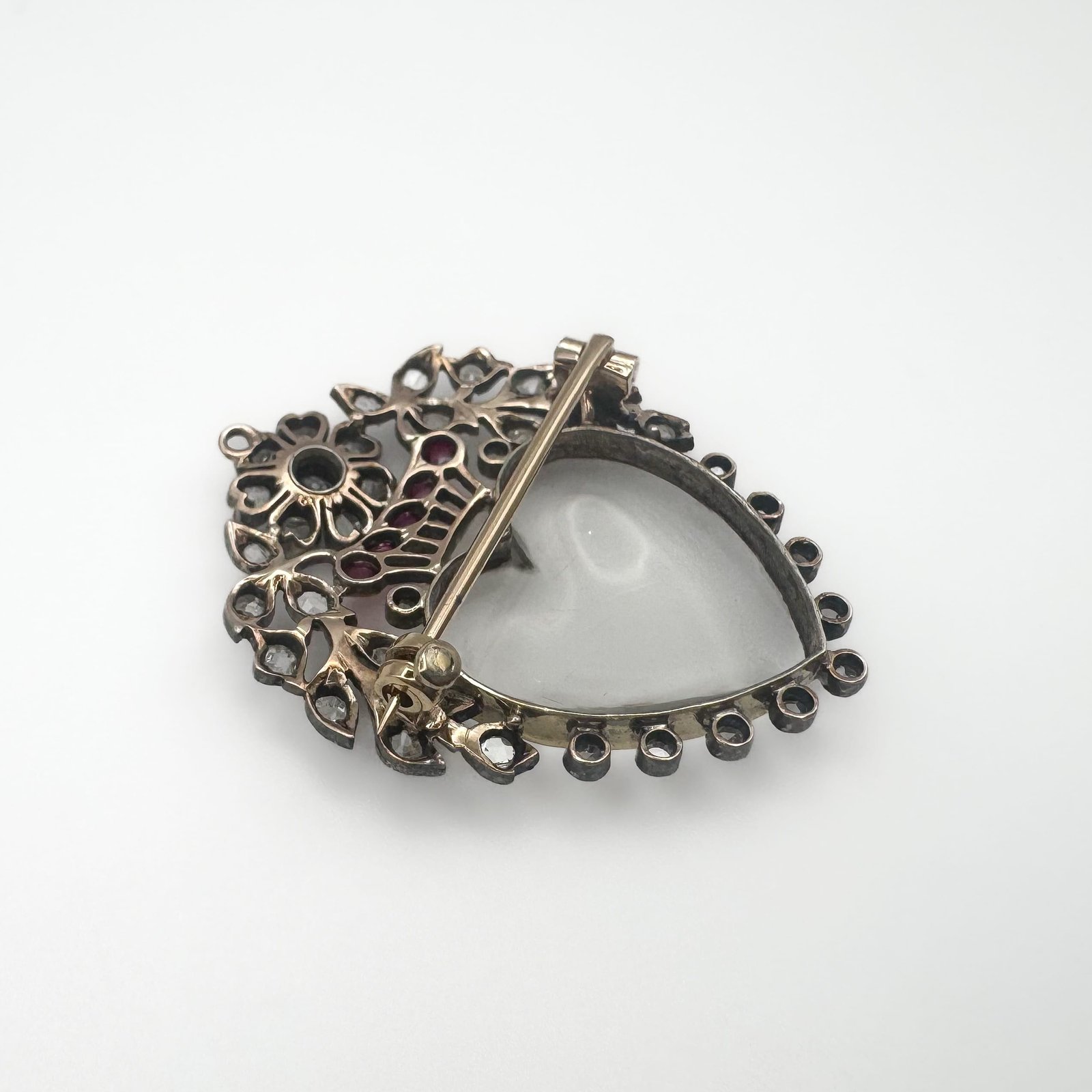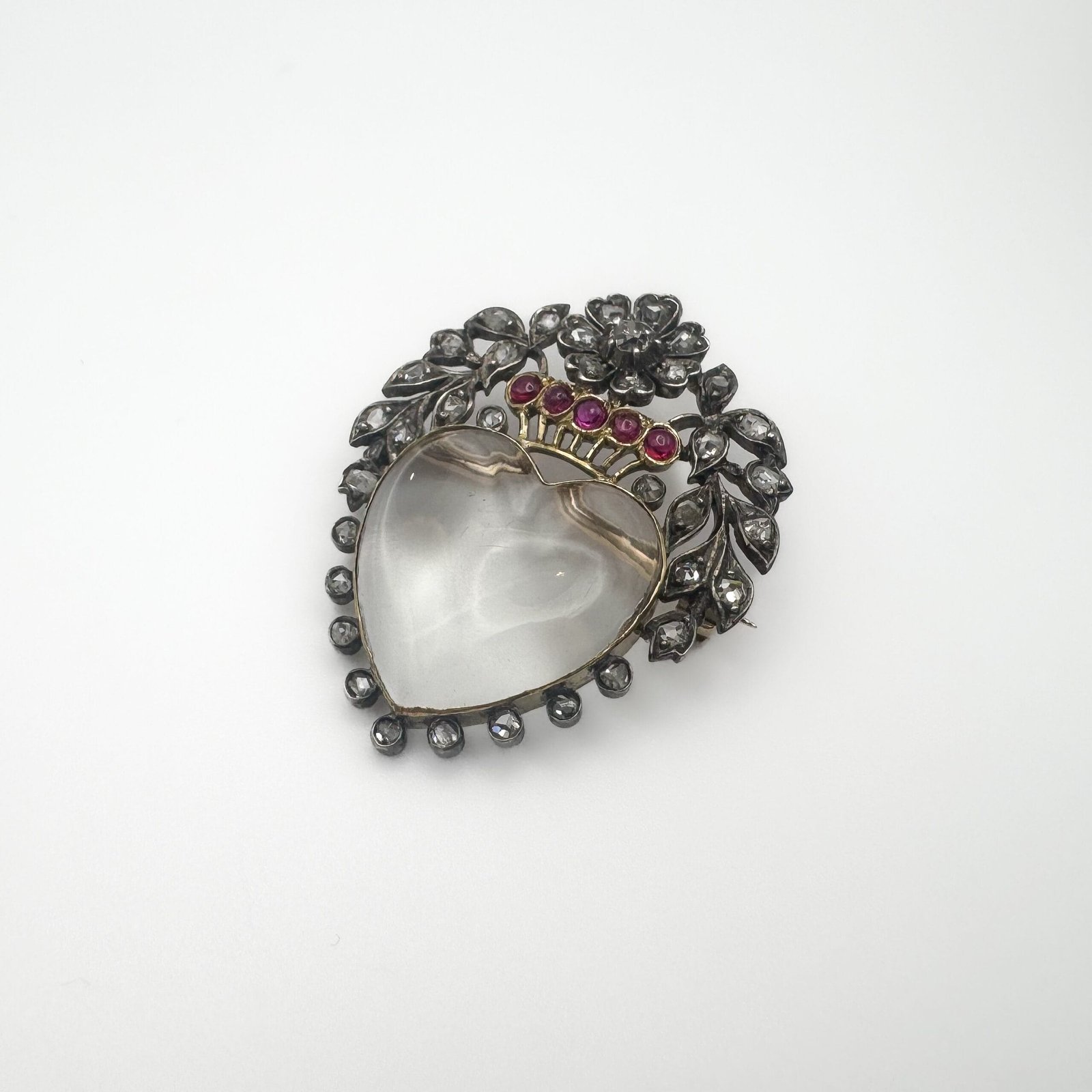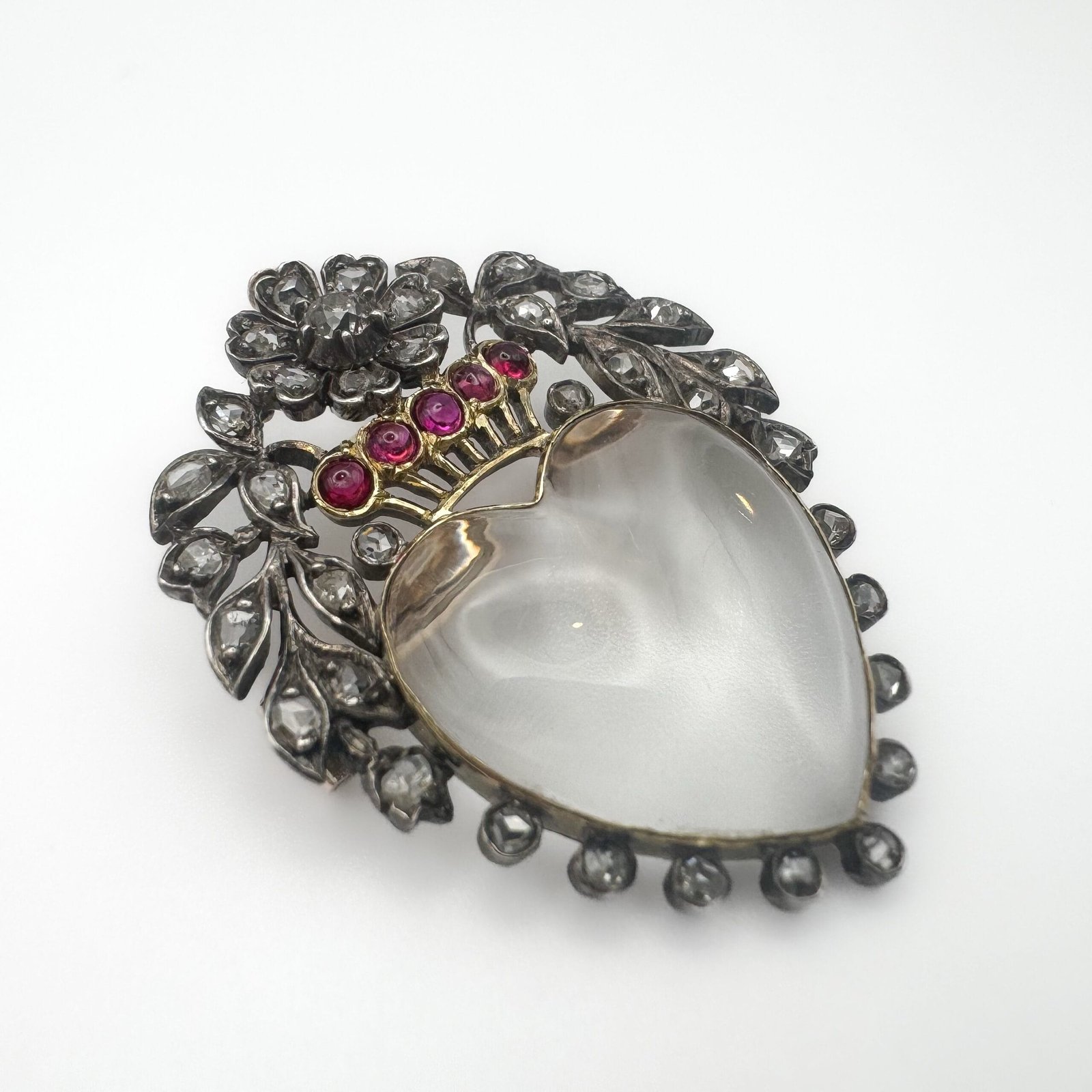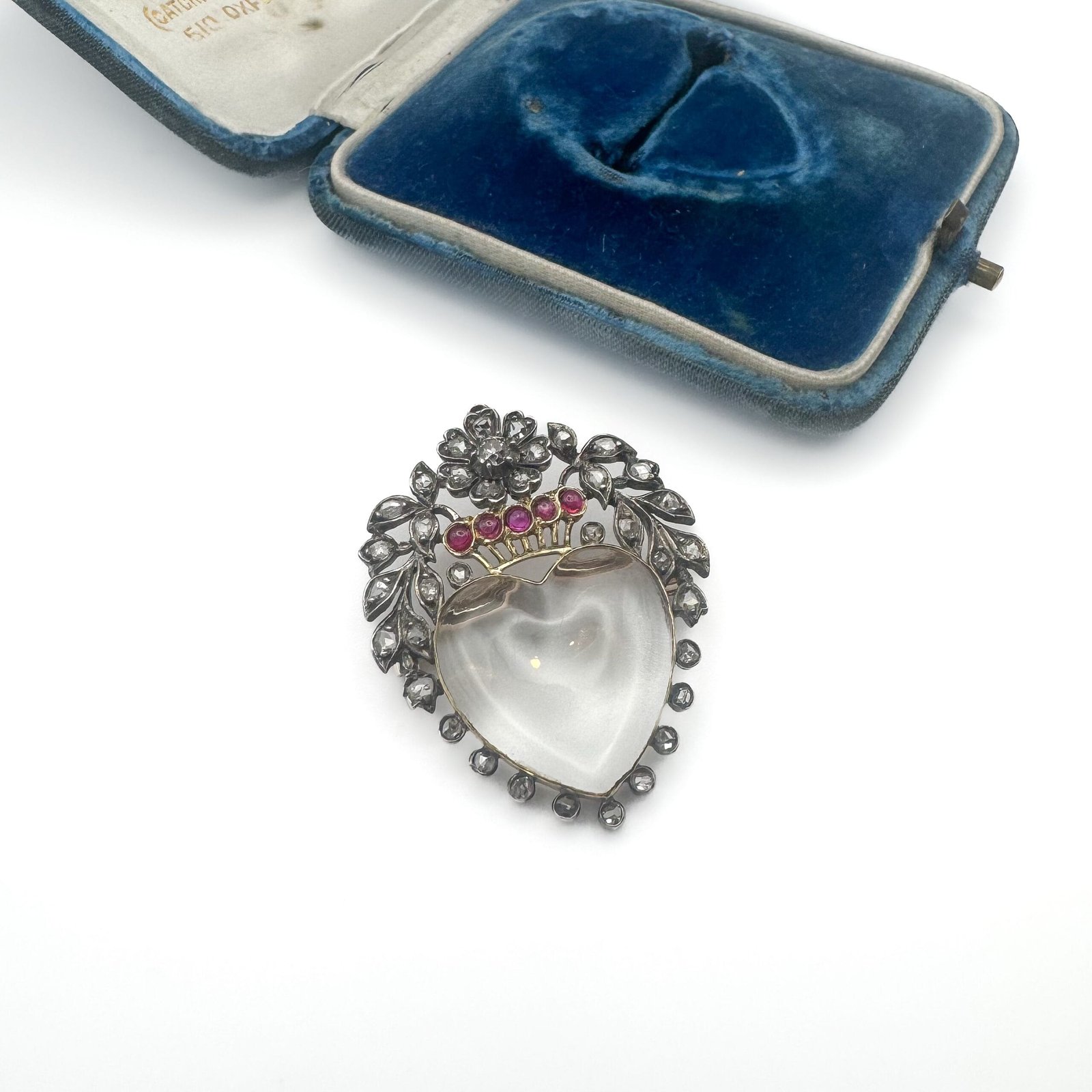 A truly special Antique in its original fitted box, comprising of a domed heart shaped Rock Crystal set in Gold and Silver, with Ruby cabouchons and Diamonds!