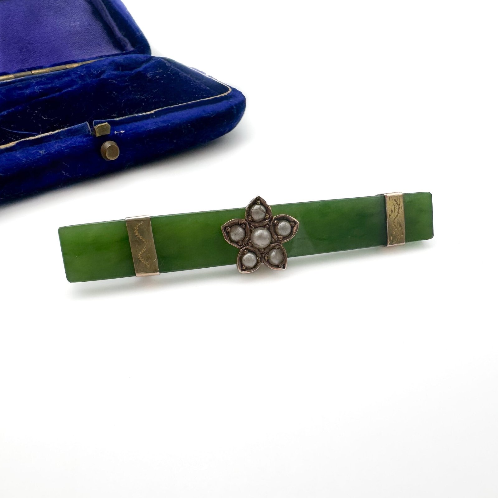 Antique jade bar brooch centred with a pearl flower in 9ct gold.