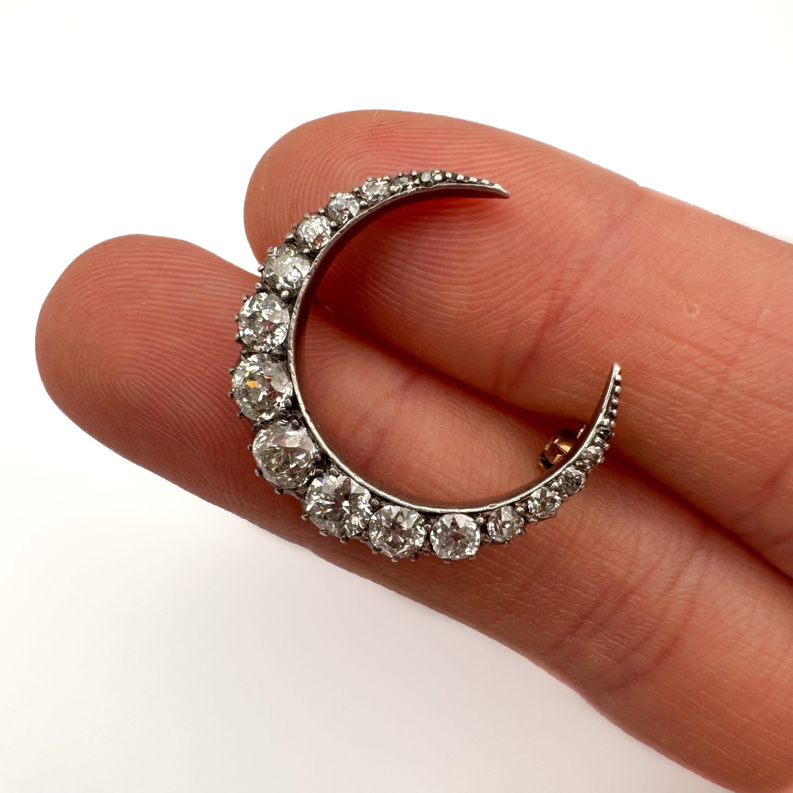 Old European Diamonds trace the moons gentle curve, this piece is bold enough to catch the glow of candlelights or fairy lights yet light enough to wear daily though the winter season