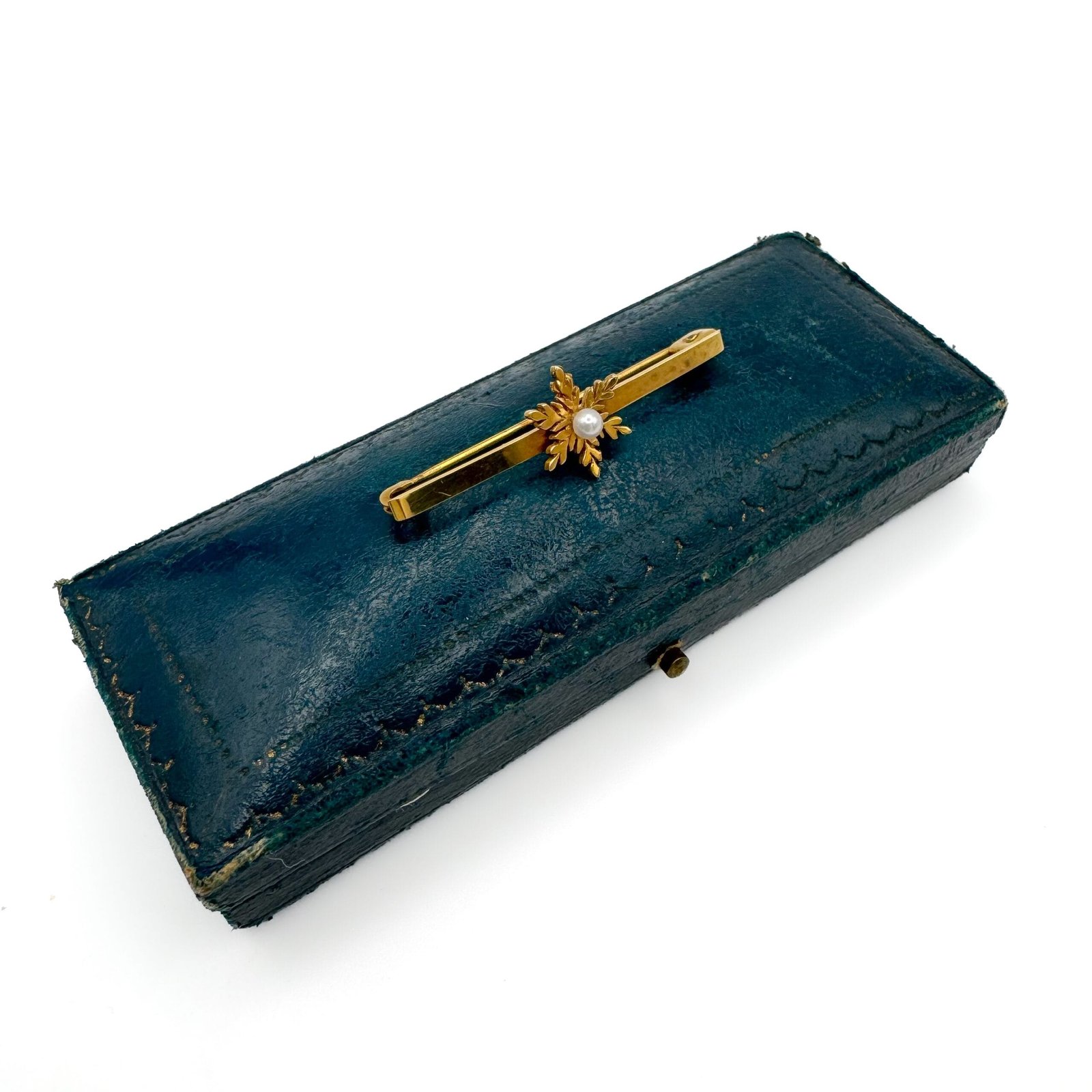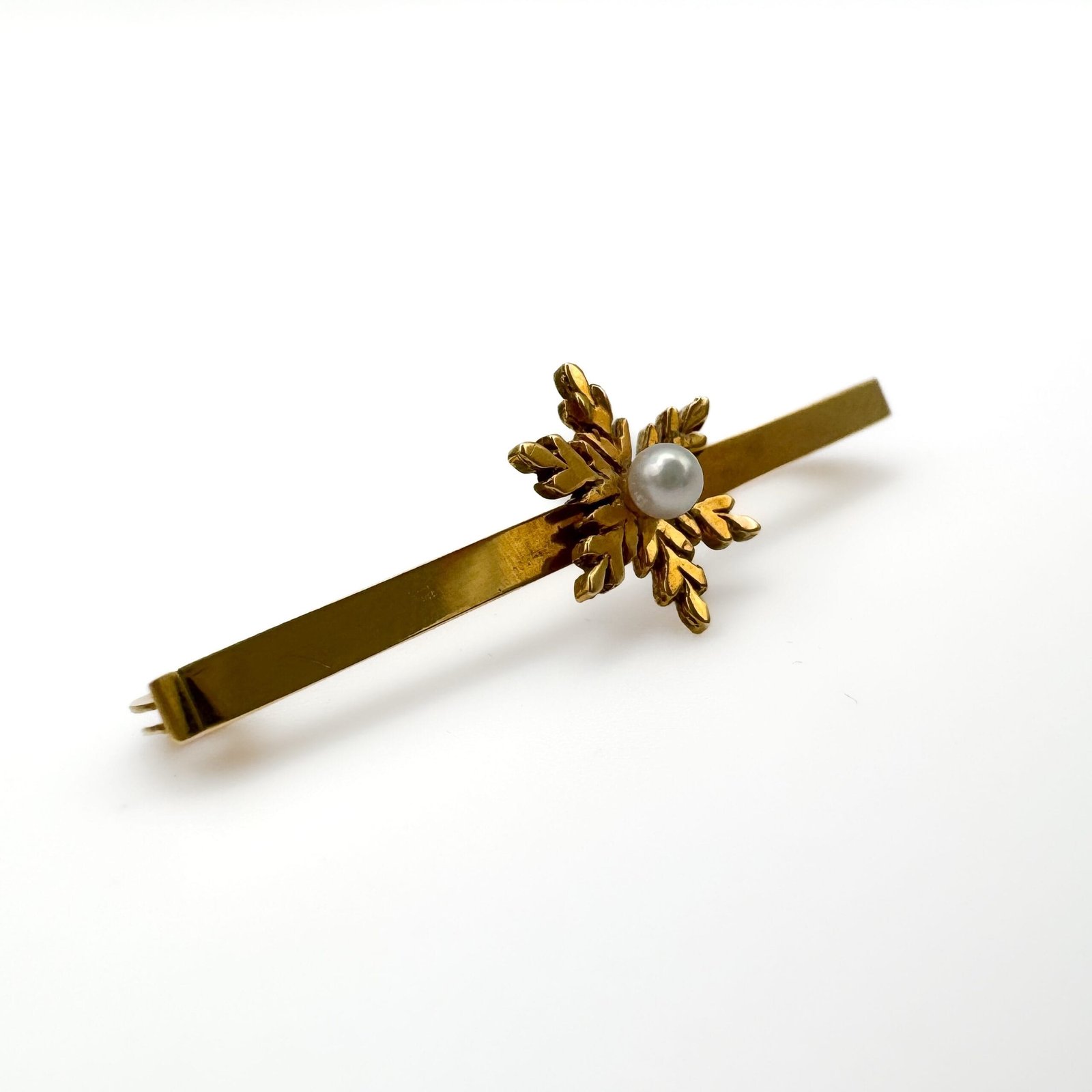Tiny petals radiate around a central pearl on a slim 37.5mm bar. At just 1.5g it pins with featherlight charm and a flash of high carat plate.