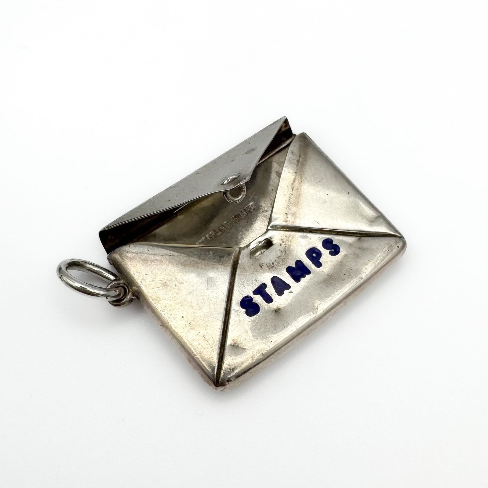 Folded envelope form with crisp blue “STAMPS” lettering and working hinge.