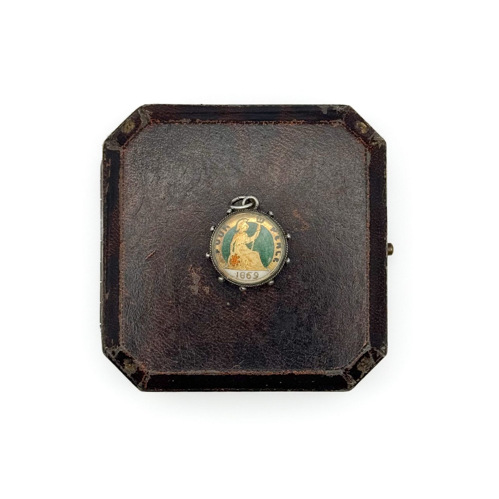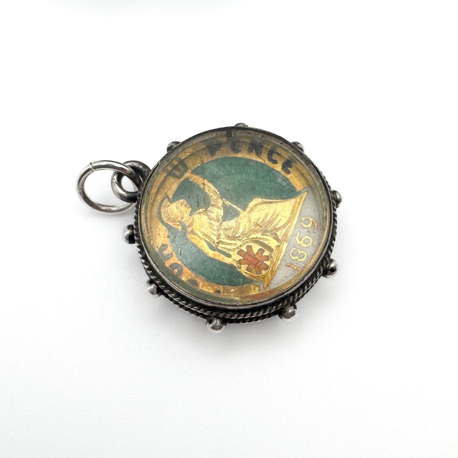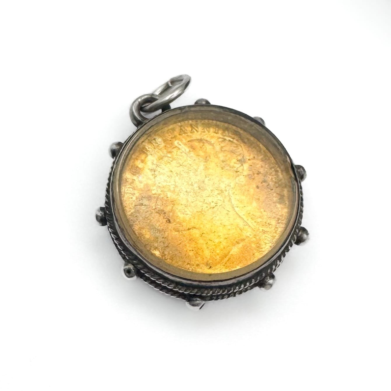 This Victorian Silver charm features an enamelled silver four pence coin under bevelled glass.